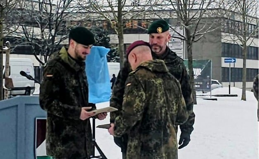 Am 03.02.2026 fand die Bestpreisverleihung unseres Bundes beim Offizierlehrgang 3 B, Ausbildungsklasse Jäger statt. Dazu trat die erste Inspektion unter Führung von OTL Zander in winterlicher Kulisse am Stein der Infanterie an. Als Gäste waren die Bataillonskommandeure/stellvertretenden Kommandeure der vier Jägerbataillone mittlere Kräfte anwesend. Der Kommandeur Lehrgruppe A, OTL Eichhorn, würdigte die Leistungen der Lehrgangsteilnehmer in den zurückliegenden Monaten und betonte ihre Verantwortung als Zugführer in den Funktionen als Führer, Erzieher und Ausbilder.