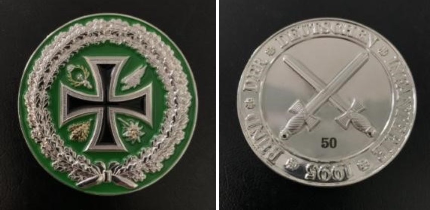 Das ist zwar zutreffend, ein unmittelbarer Zusammenhang mit dem Wappen des BDInf war aber für uns nicht erkennbar. Es war keineswegs beabsichtigt, das Wappen in erster Linie als „Auszeichnung“ zu verwenden, schon gar nicht im Bereich der Bundeswehr, in der auch die (unbeanstandeten) Kopfbedeckungsabzeichen nicht der Würdigung „besonderer Leistungen“ dienen.