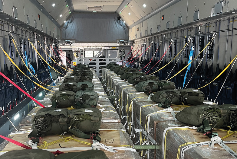 Dieser Ansatz hätte allerdings dazu geführt, dass sämtliches eingesetztes Material verloren gegangen wäre und somit die Fähigkeit zum Absetzen von Lasten (auch nach Zulassung der Absetzsysteme CDS und ADS) für die Bundeswehr auf unabsehbare Zeit nicht mehr zur Verfügung gestanden hätte. LL/ LTrspS entwickelte daher unter Federführung des LTrspZg und unter Einbindung WTD 61 sowie TTVG LTG 62 ein „Low Cost Aerial Delivery System“ (LCADS), welches weitestgehend aus handelsüblichen oder bereits ausgesonderten Komponenten besteht und brachte dies innerhalb von drei Wochen zur Einsatzreife (Abb.4). Zeitgleich erfolgte die Einsatzvorbereitung des in der Entwicklung und Erprobung des LCADS eingesetzten Personals für die Verlegung nach JOR zum Aufbau der Lasten vor Ort. Nach der ersten Idee am 18.03.2024